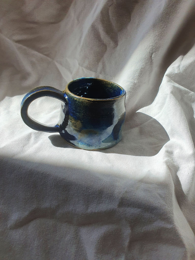 This mug has been thrown and glazed by myself using a very distinct chun blue glaze. This mug is approximately 10cm in diameter and 13cm in height.