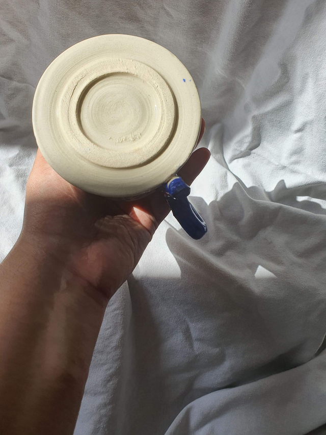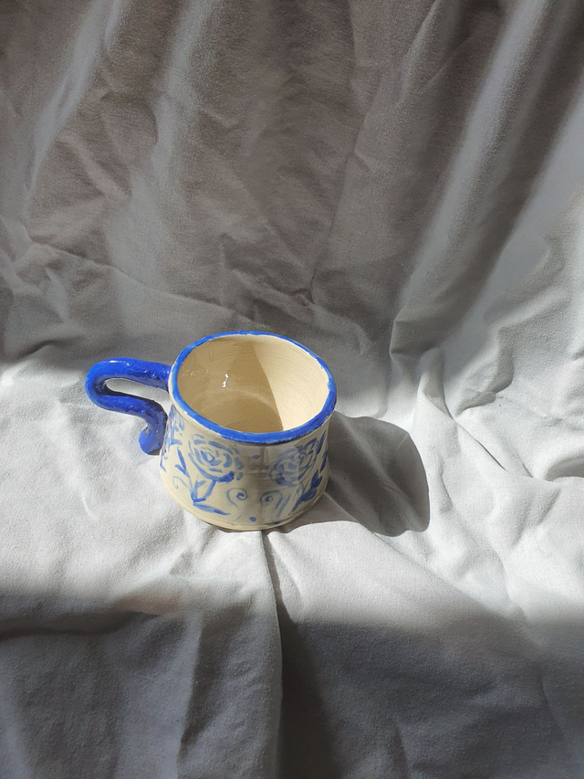This mug has been thrown and glazed by myself using electric blue to paint the rose design. This mug is approximately 10cm in diameter and 16cm in height.