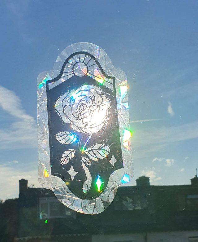 - Remove the film and apply the suncatcher, make sure to place in a sunny spot for it to make rainbows in your room!