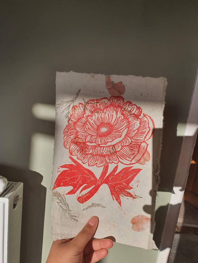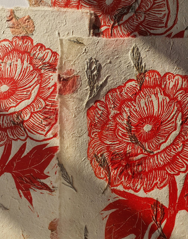 Red poppy linocut on handmade leaf paper